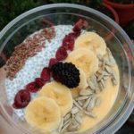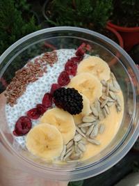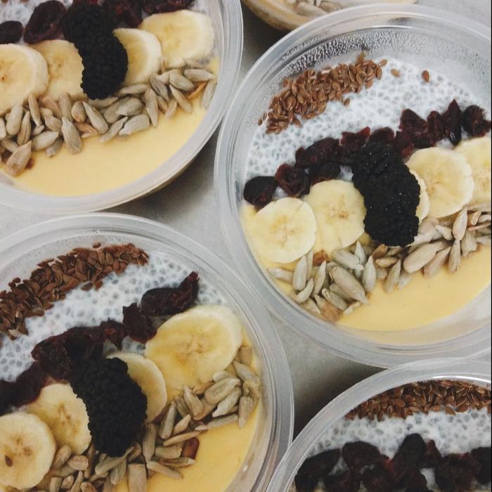 Overnight muesli dengan campuran yogurt dan buah segar ditopping saus buah serta superfood dan dried fruits.