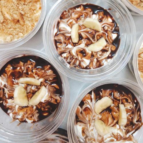 Chia pudding coklat dengan potongan buah pisang dan lapisan greek yogurt lembut berpadu saus coklat serta granola coklat yang renyah. Yummy!